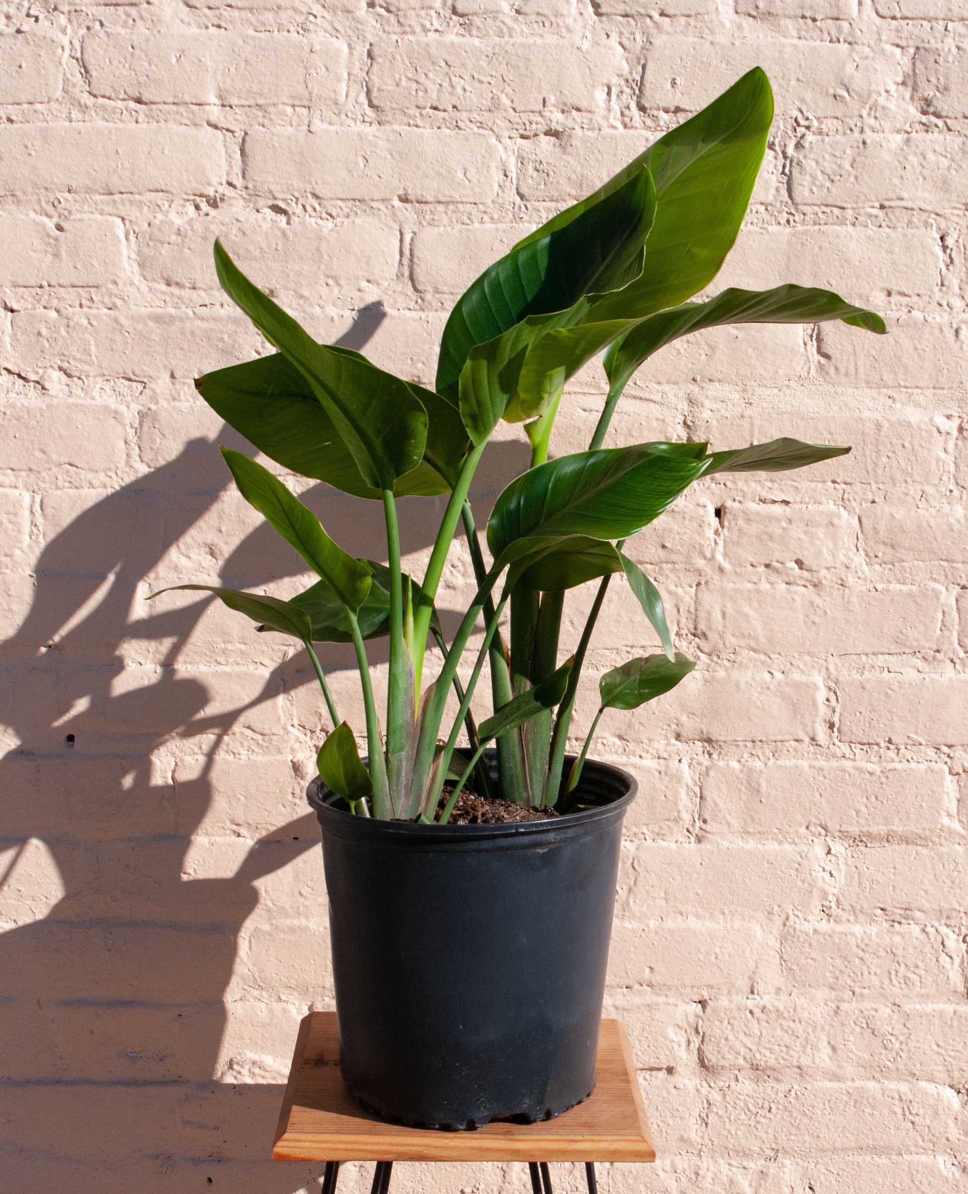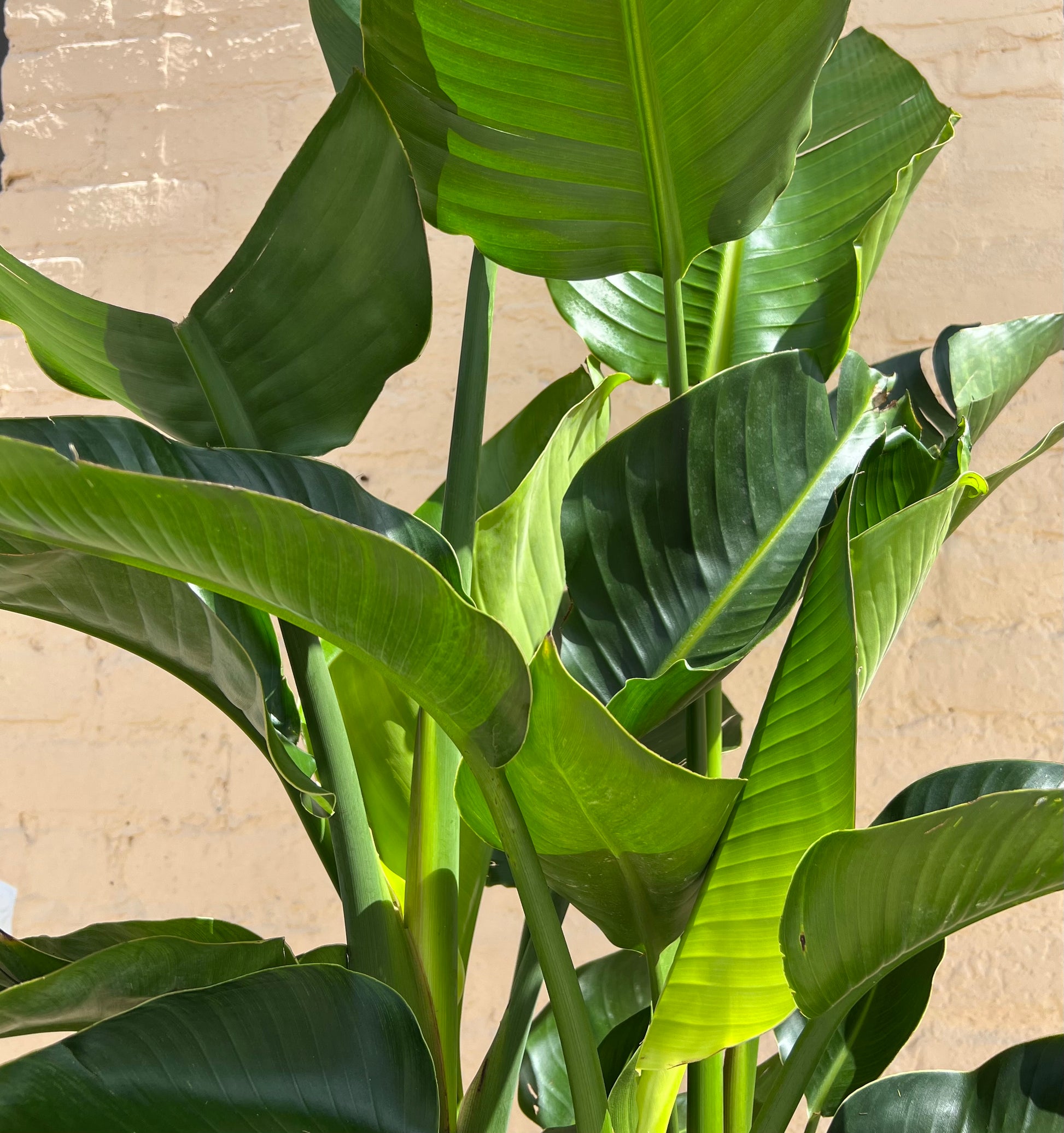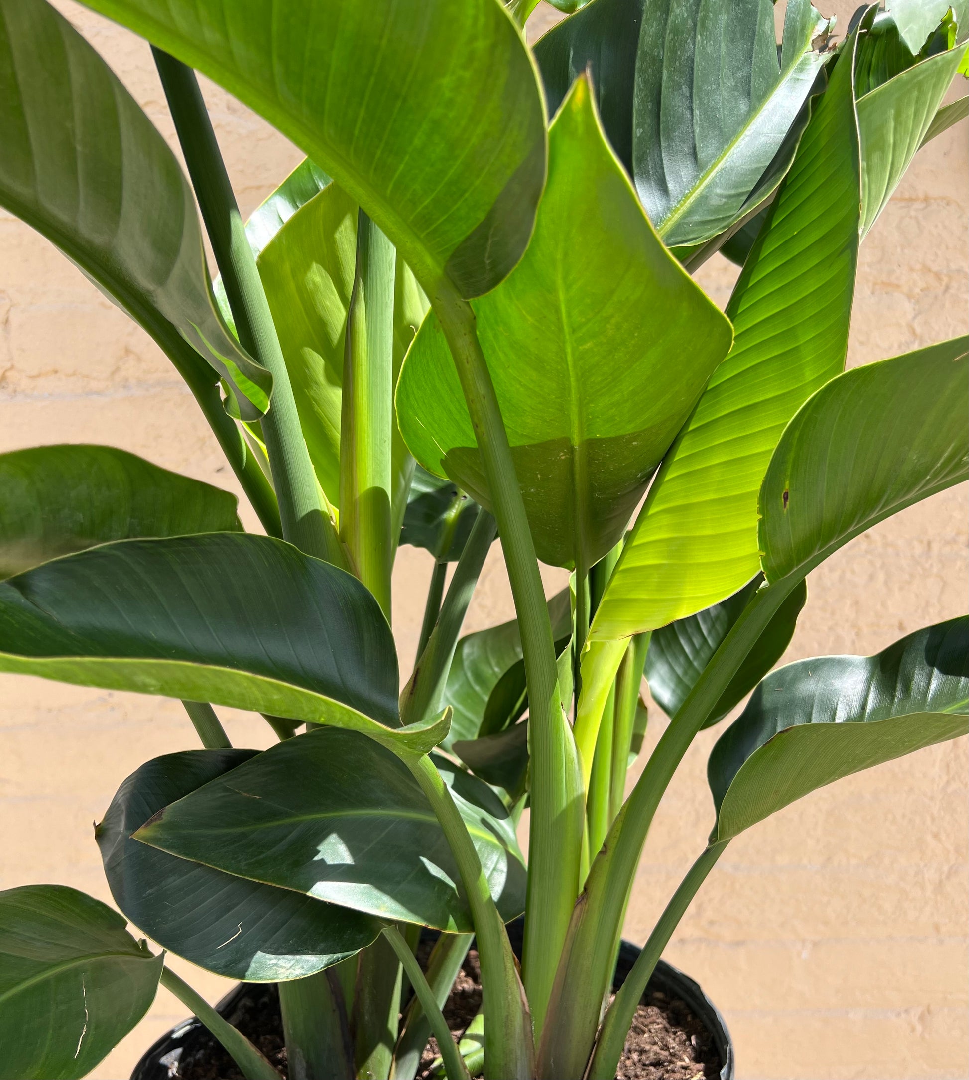 Bird of Paradise (Strelitzia nicolai) is native to parts of Southern Africa, and prefers bright indirect light. A few hours of direct sun is ok, they'll be happiest near a south or west facing window. Water when the top third of soil dries out,