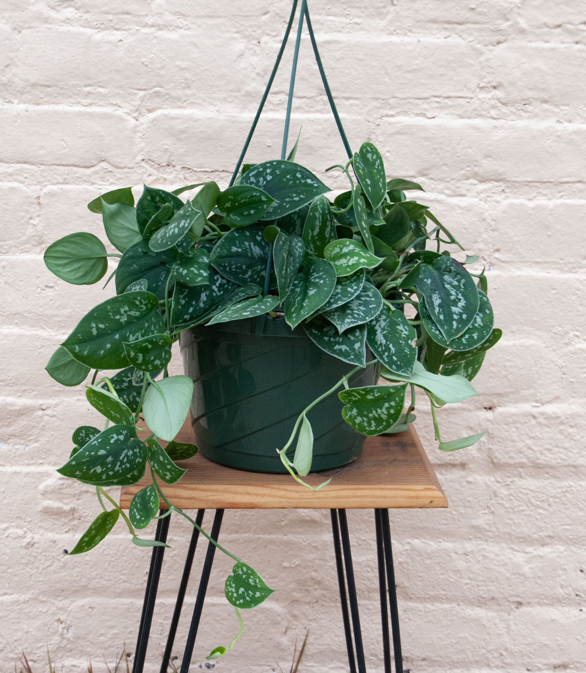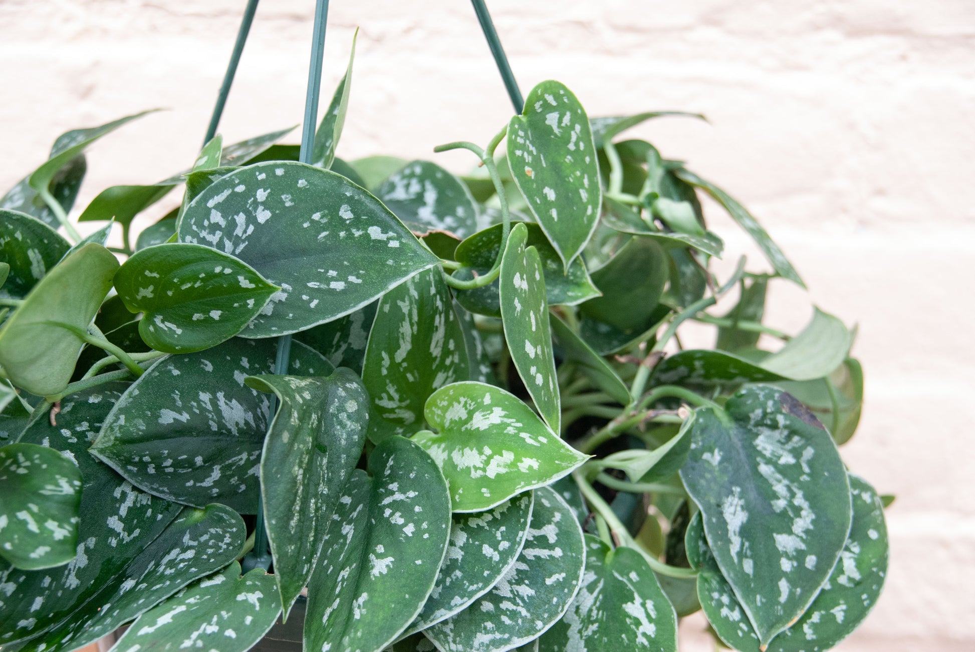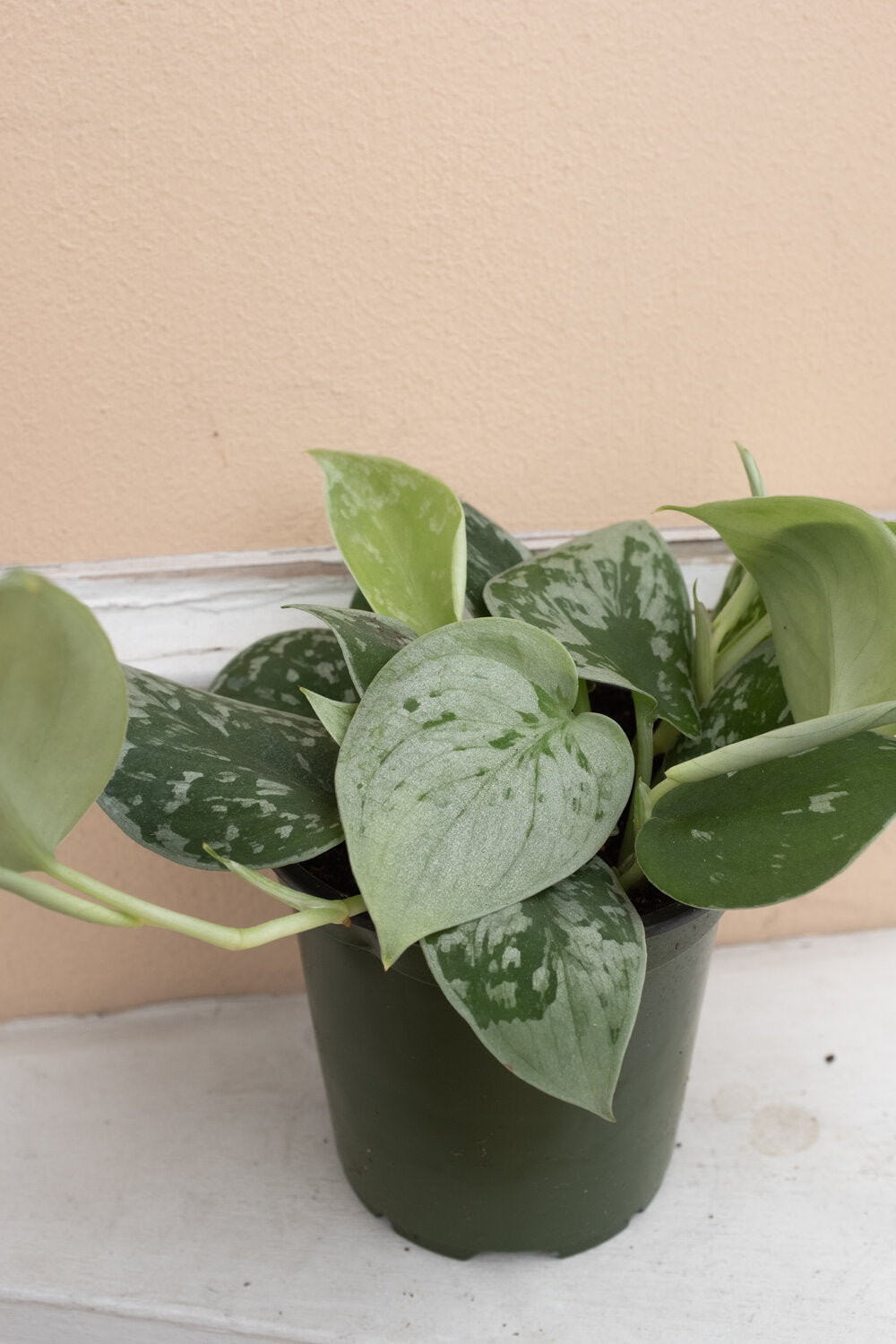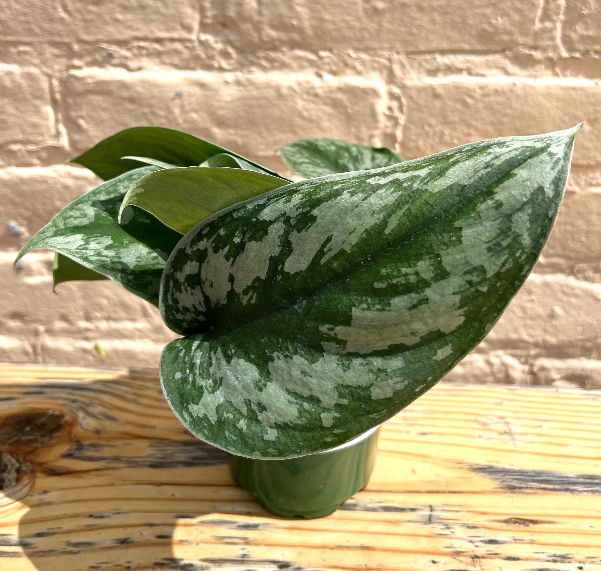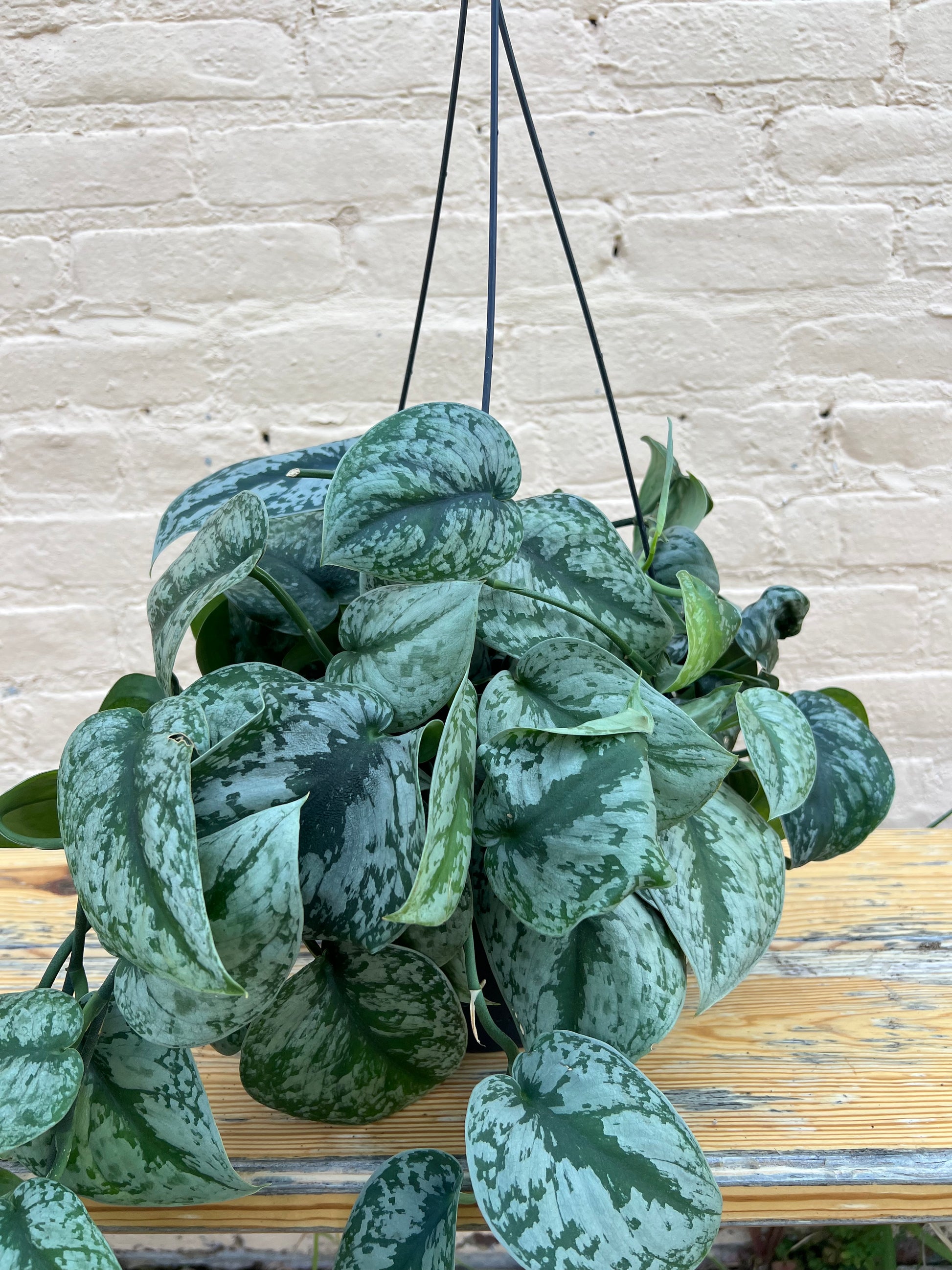 Silver satin pothos prefer indirect, bright light due to their variegation; avoid placing plant in direct sunlight-this will scorch the leaves. Water when the top 50% of soil has dried. Cuttings may be taken by using sharp, sanitized shears and cutting just above a node; place the cutting in water and allow 2-3" of multiple roots to grow before placing in soil.