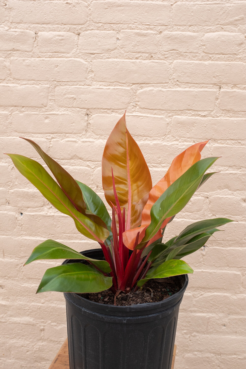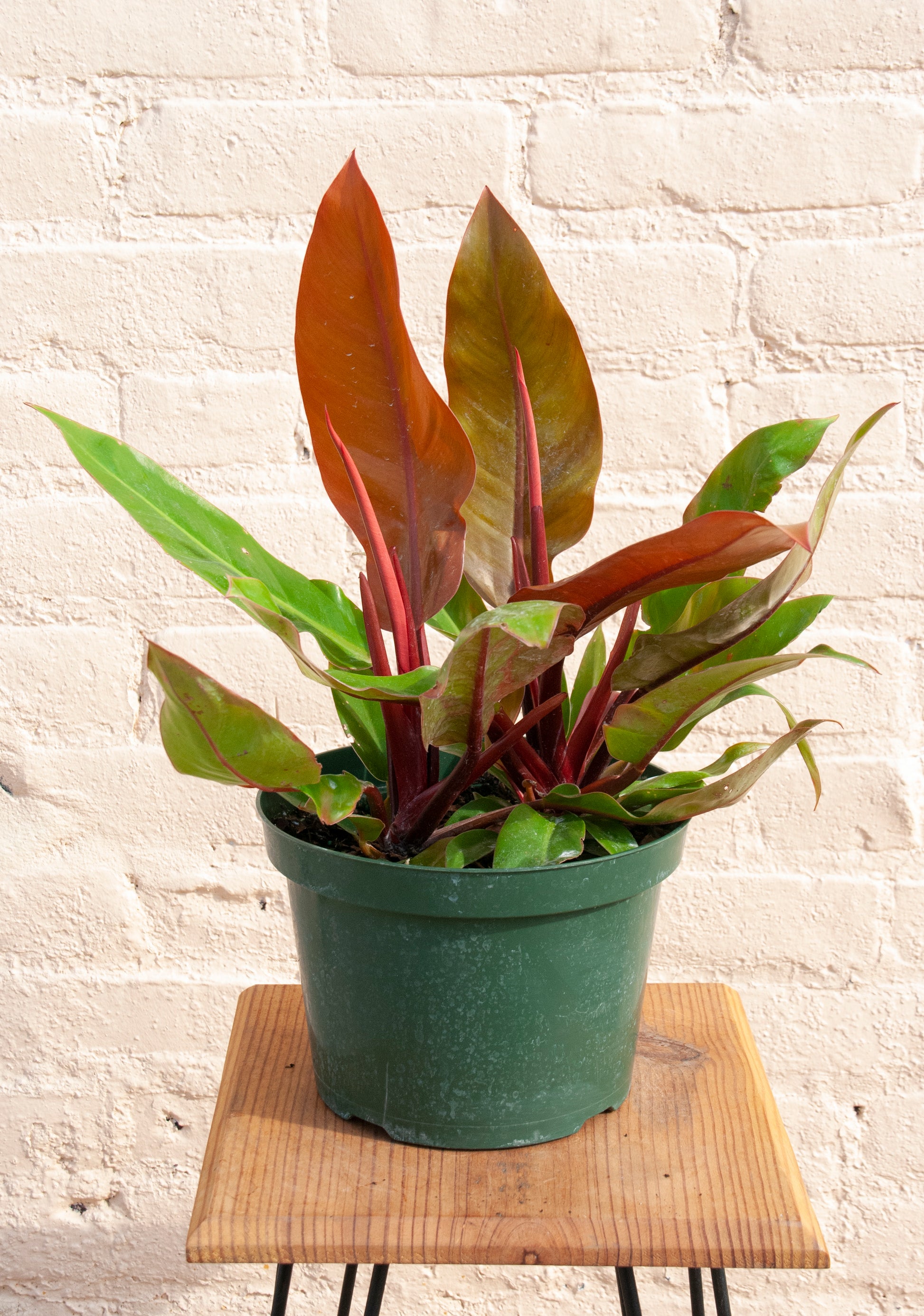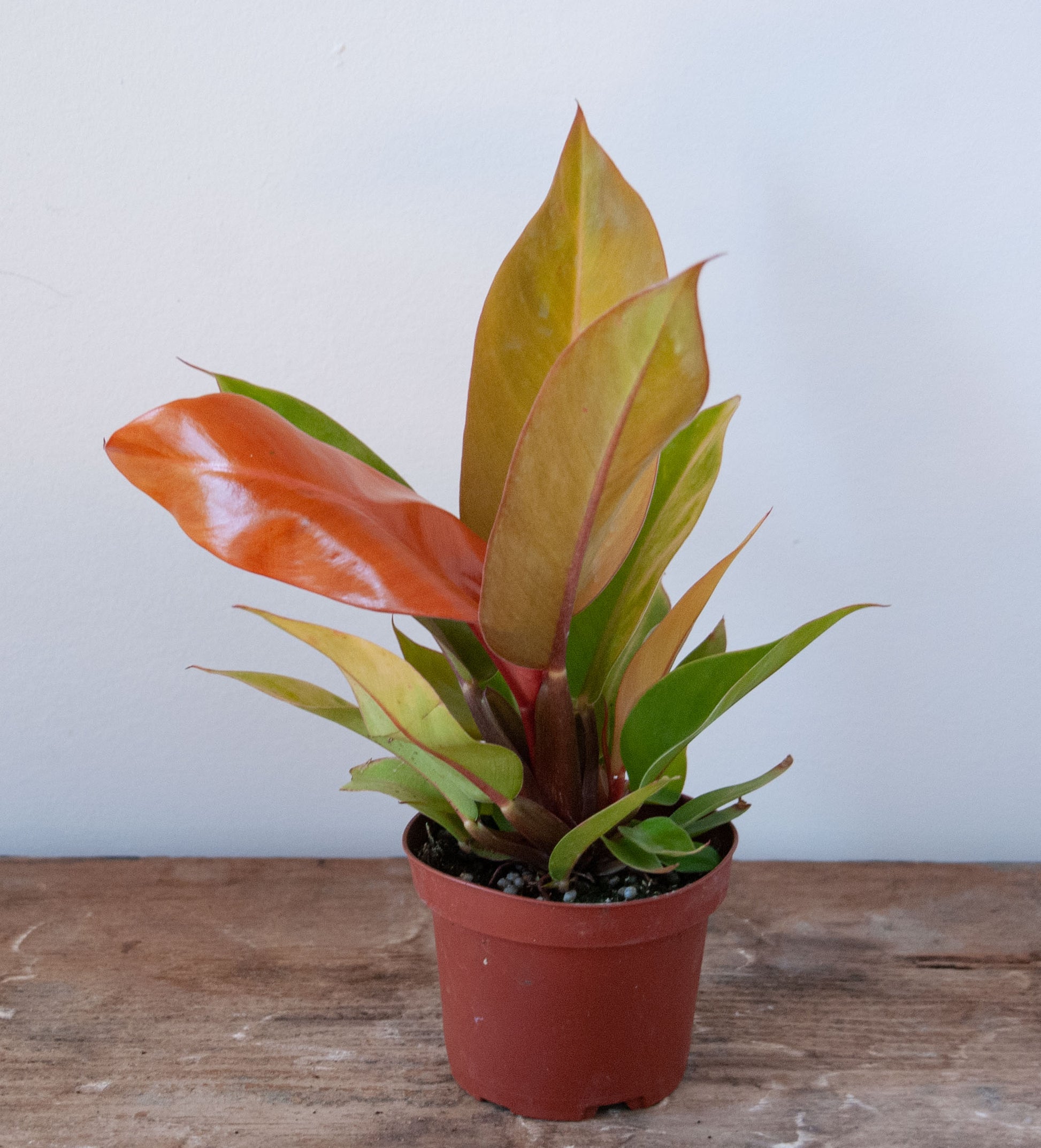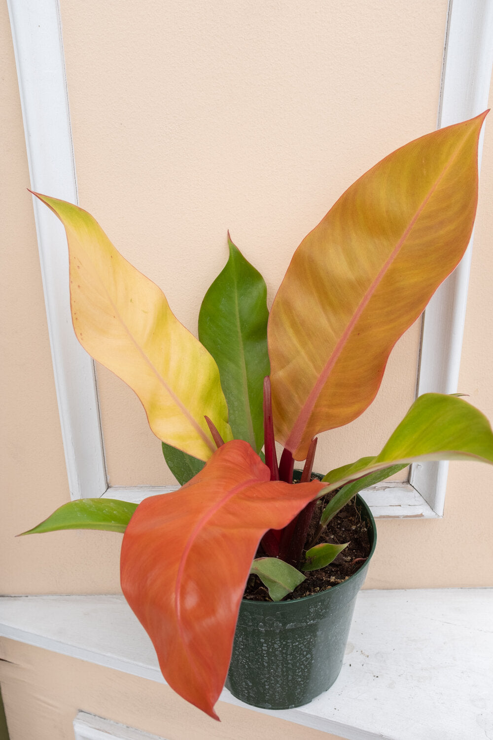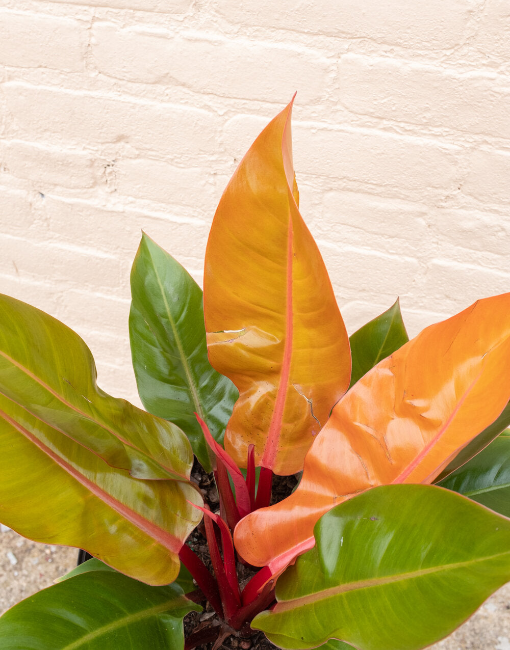 The Philodendron Prince of Orange is a hybrid (meaning it does not naturally occur in nature) that grows its leaves from the center of the plant, rather than vines and stems like other philodendron species. These plants prefer bright indirect light and to be watered when the top 50% of soil dries.