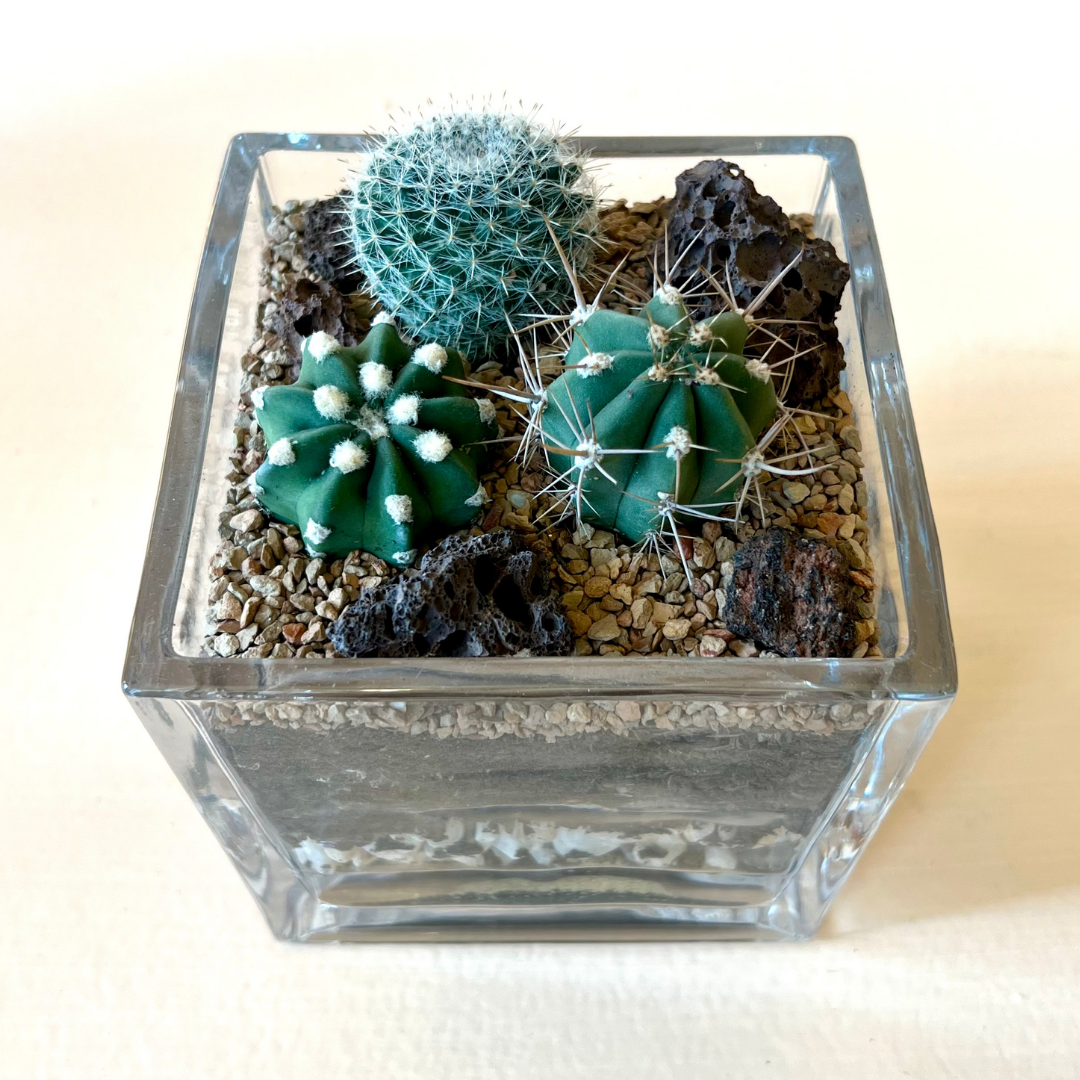 Mini cacti planted together in a glass cube vessel. We will select from a variety of arrangements, you will not receive this exact design.
