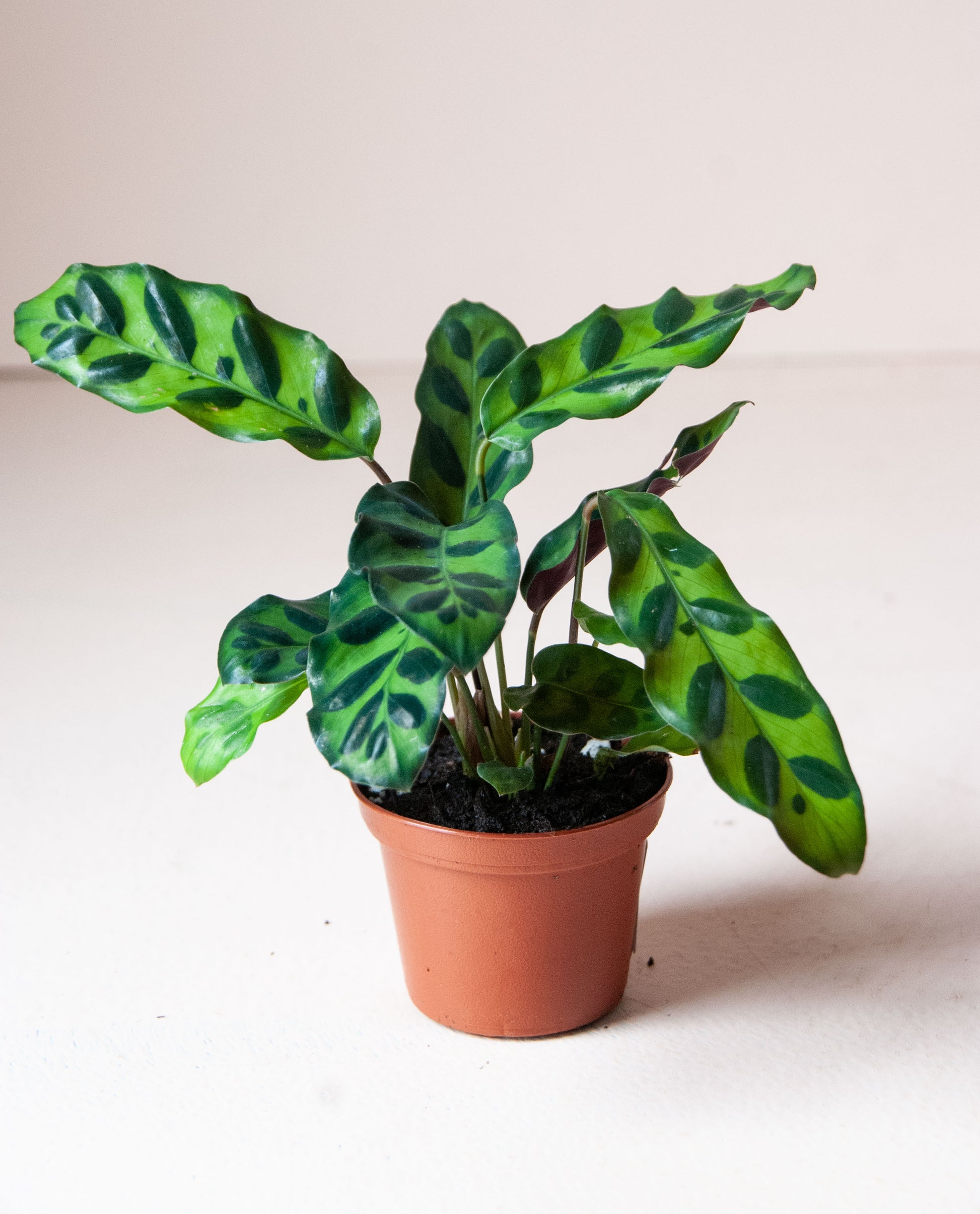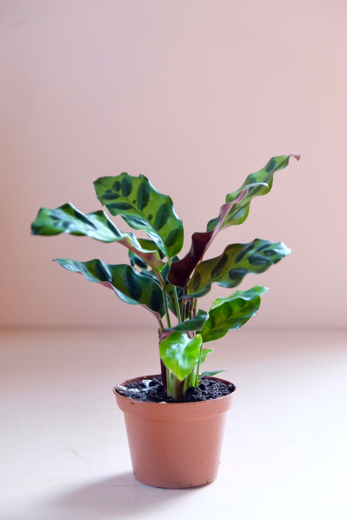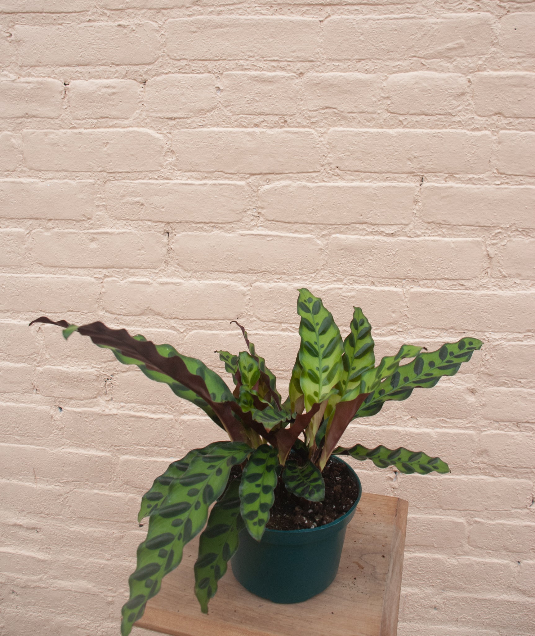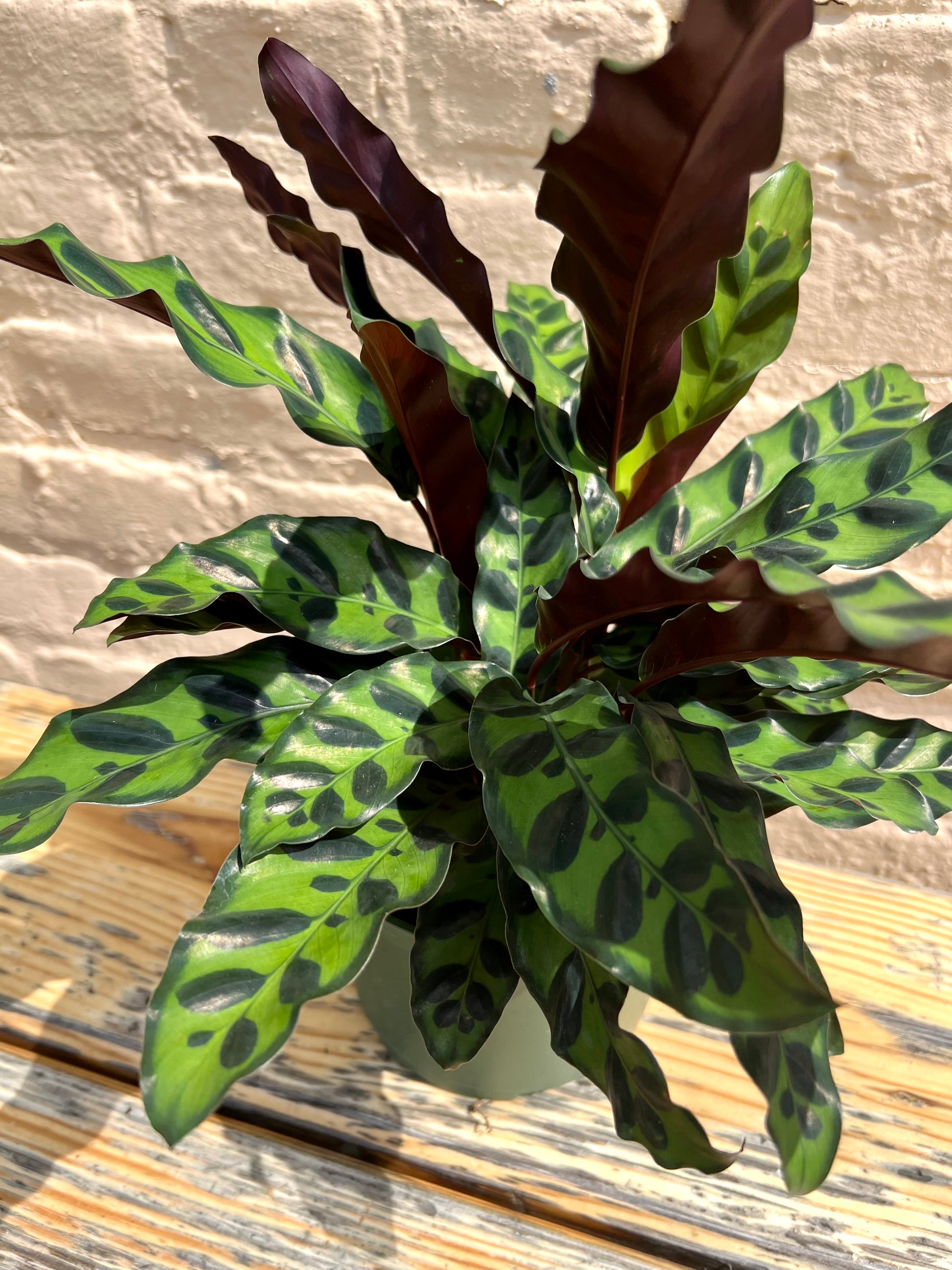 AKA Calathea Rattlesnake. Native to South America, Calathea sp. enjoy bright, indirect light and water when the top 1/3 of soil dries out. High humidity is a plus, leaf tips can brown from low humidity and under watering. Distilled water is preferred when watering, this species can be a little particular!