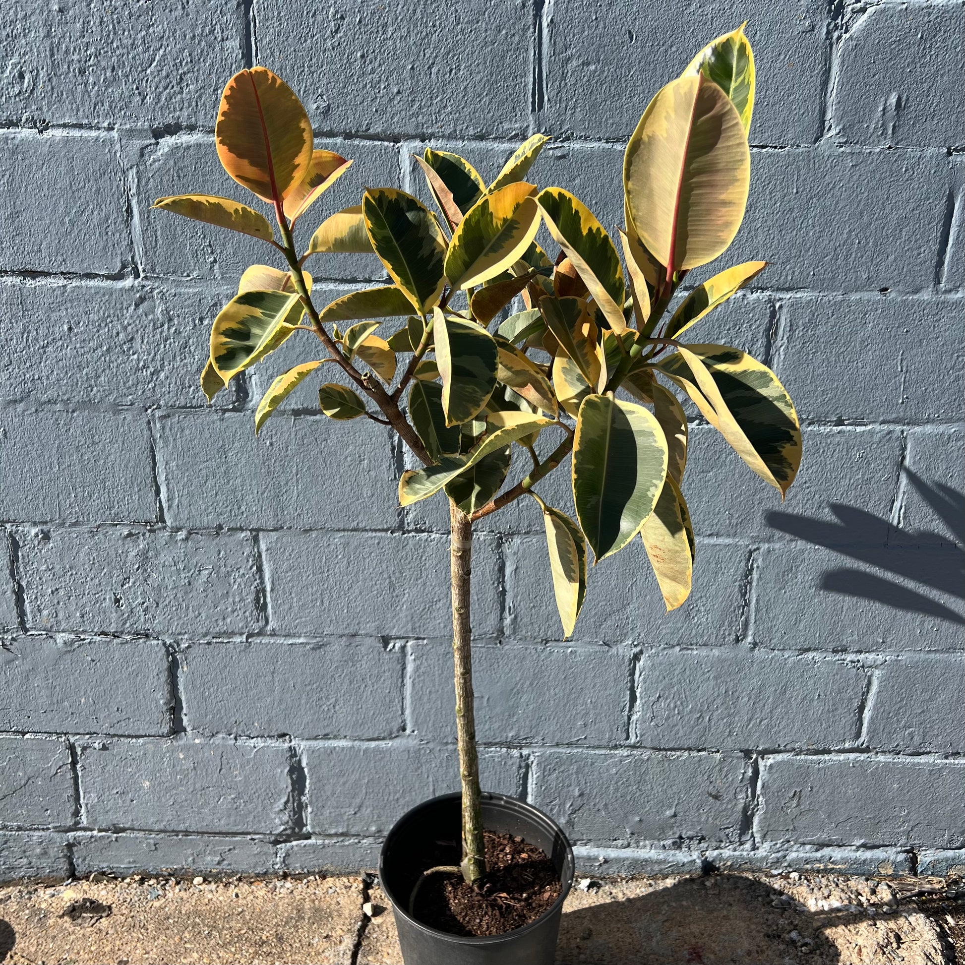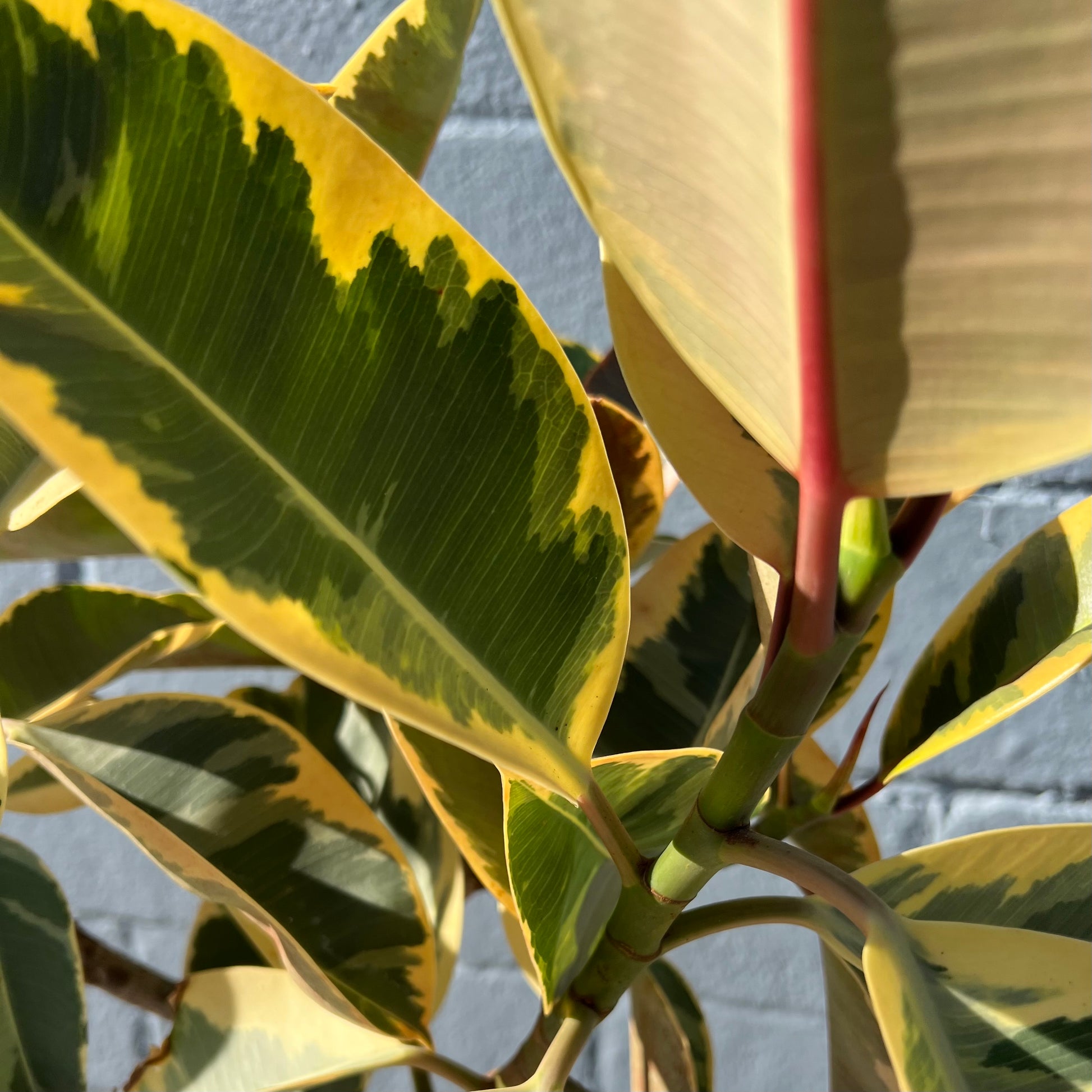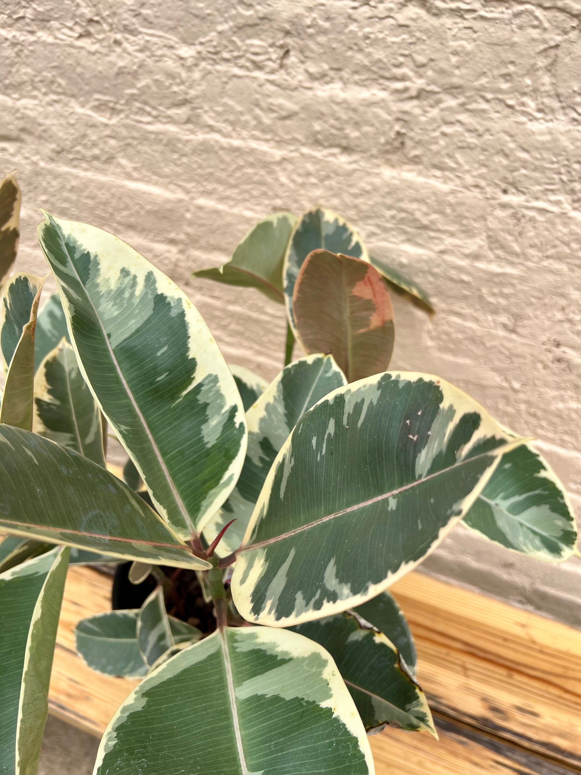 Ficus elastica 'Tineke' is native to Southeast Asia. It is also known as Rubber Tree, Rubber Plant, or Rubber Fig.