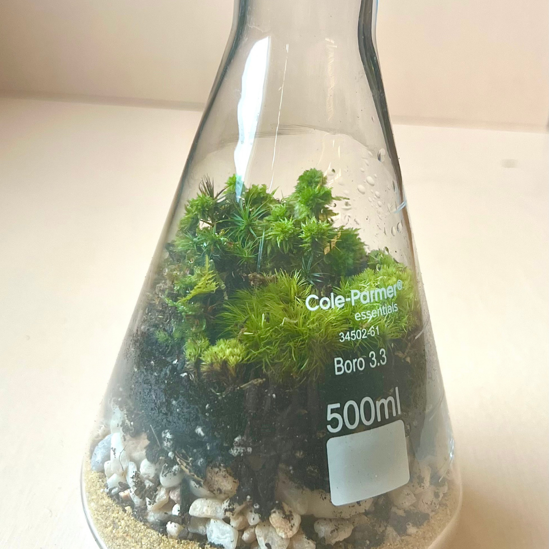A low maintenance mossy world created inside a laboratory flask. Low maintenance and incredibly fun to watch the moss grow!