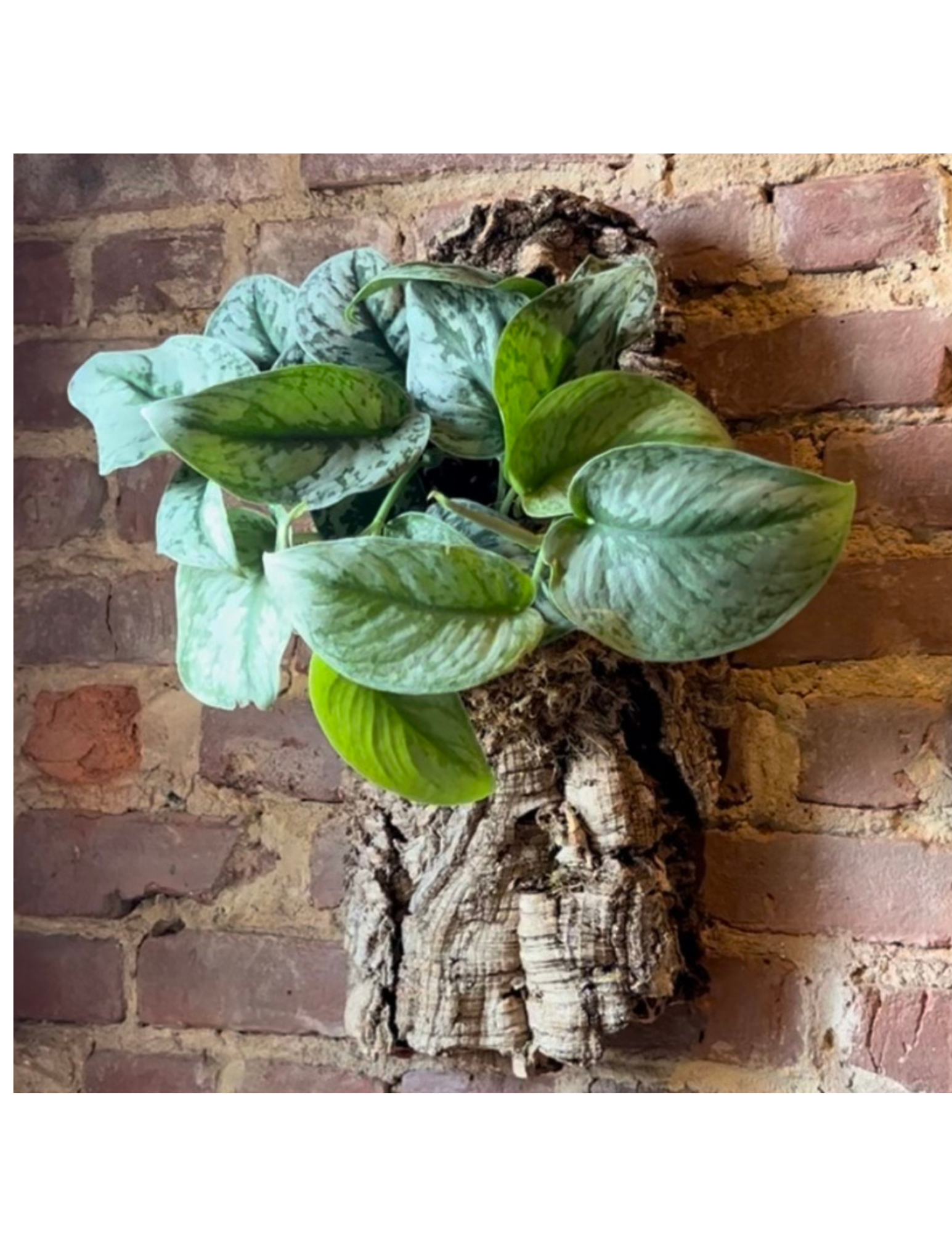 Assorted vining and epiphytic tropicals mounted on cork boards. A very light-weight and natural-looking option. Has hanging wire attached to the back and can hang easily on any nail or screw in the wall.