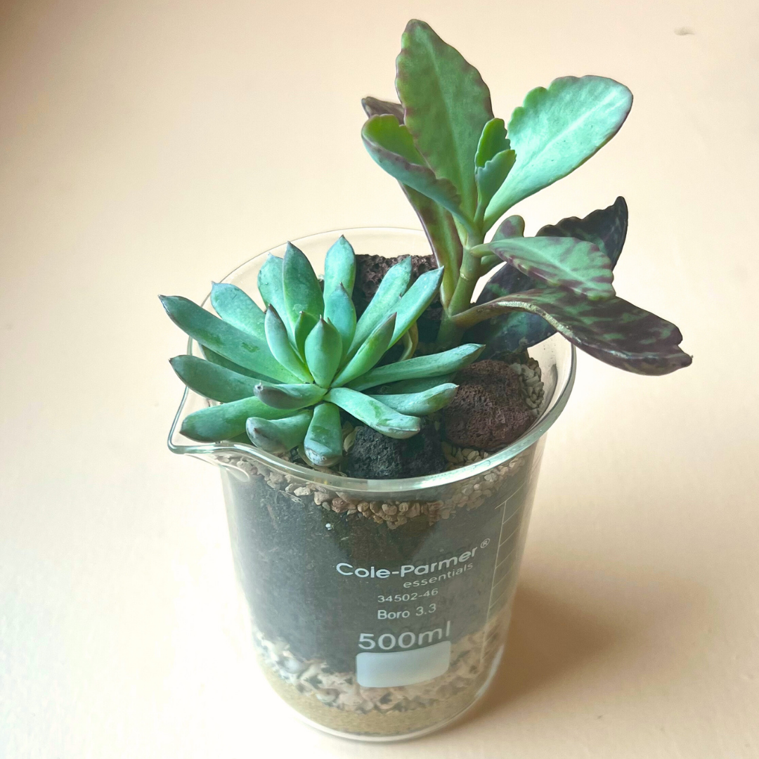 Succulents arranged into a laboratory glassware beaker. We will select from a variety of arrangements, you will not receive this exact design.